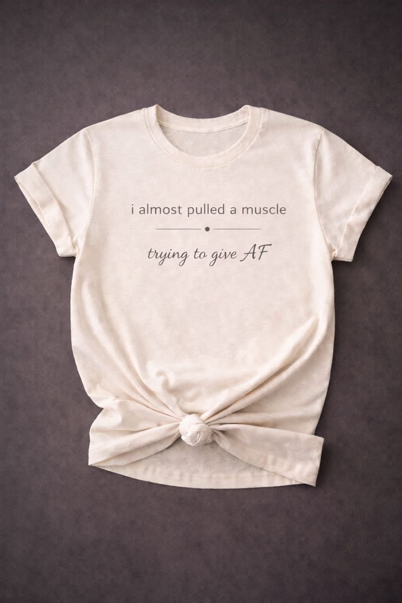 This “I Almost Pulled a Muscle Trying to Give AF” tee is made for the days when your patience is gone and your humor is loud. Soft, lightweight, and effortlessly comfortable, it’s the perfect everyday tee for anyone who thrives on sarcasm and unapologetic energy. The clean, bold typography makes it easy to style with jeans, leggings, or cozy layers. Perfect for:
